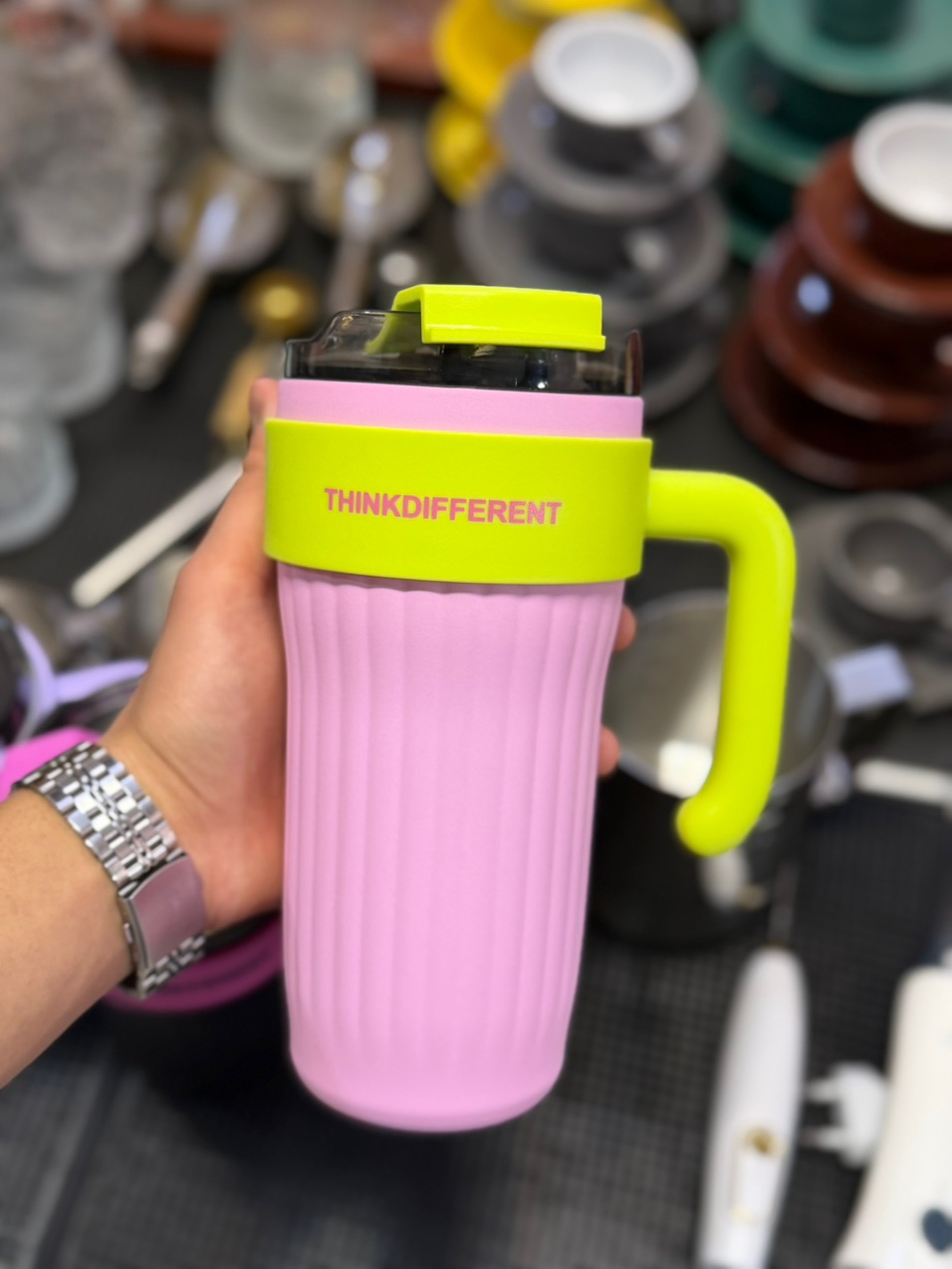 تراول دستهدار لوکس Think با بدنه استیل ۳۱۶ دوجداره، نی استیل، درب ضد نشتی، طراحی لوکس و دستگیره خوشدست، مناسب برای استفاده روزمره و هدیه.